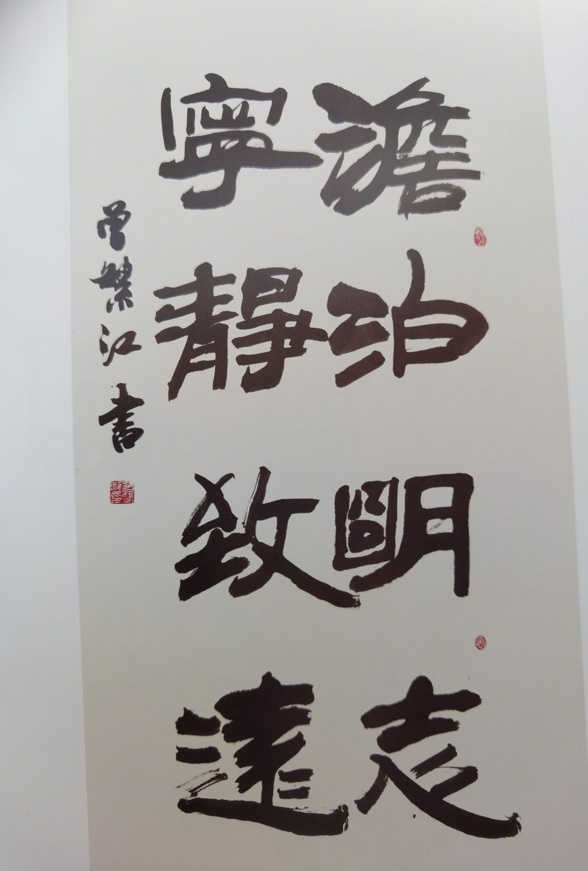 其书法根植传统,力求新意。其行书和隶书笔力劲健洒脱,姿态变化丰富,章法规范爽朗,雅俗共赏。其榜书用笔爽劲,结字严谨,大气挺拔,极具视觉冲击力。
