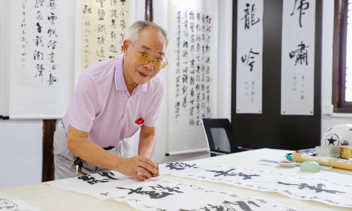 个人简历 小传:沈凯新(原名胡大辂),字益生、号瘦石。1945年5月出生。祖籍安徽歙县,中学退休教师。自幼临柳体入手,年长习二王及颜、米字,兼习篆隶。喜篆刻,擅榜书。曾结集出版《沈凯新书法作品选》,作品两度在江苏省美术館展出。众多作品在诸多刊物上登载,亦被许多院校收藏。