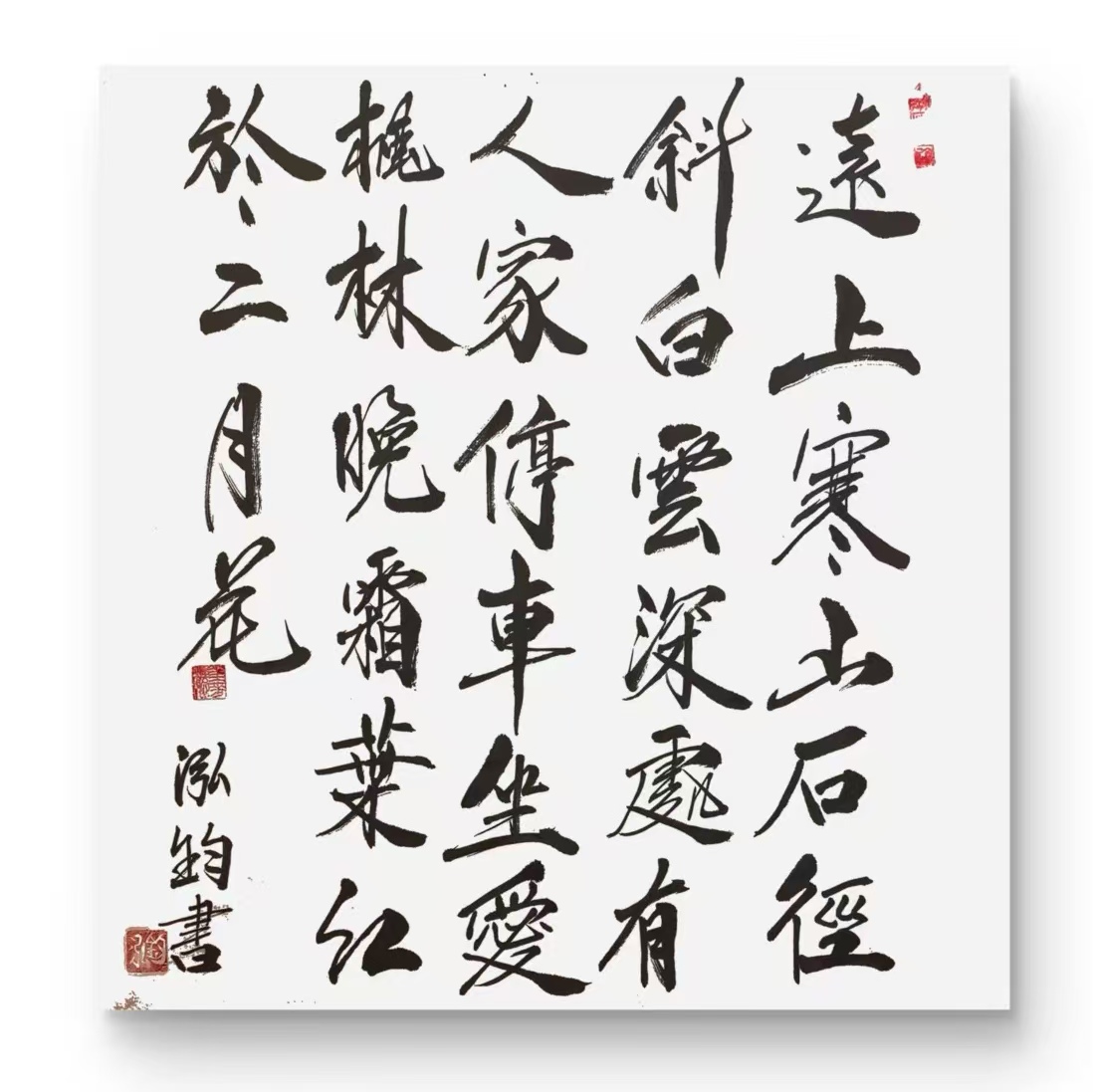 熊泓钧(熊万军) 祖籍:湖北、咸宁,盐城市盐都区十六届、十七届人大代表,上海市静海书画院副院长、盐城市亭湖区书画家协会名誉主席、盐城市胡海书画院副院长。6岁学习工笔,12岁师从著名书法家谦斋(高小岩)先生学习书法。2002年作品入围在青岛举办的《中国书法兰亭奖》、2018年《首届崂山杯全民书法大赛》创作奖、2021年江苏省总工会书法比赛三等奖、《秦韵杯全国书法大赛》三等奖。