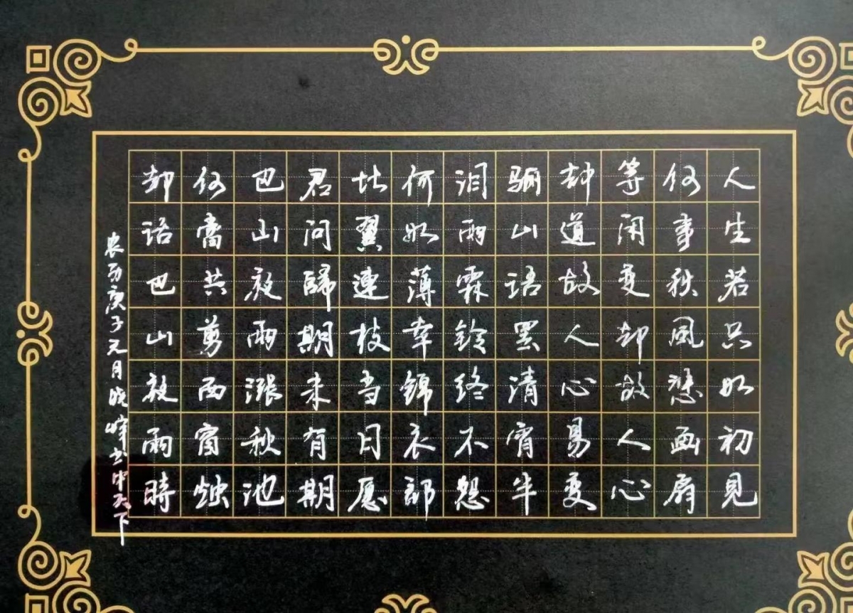一次偶然“临摹”,与“写字”结缘。上学前班时,有一天,老师在黑板上用粉笔写了“毛主席万岁”几个字,下课后便擦掉了。这时候,我不知哪来的一股勇气,走上黑板前,拿起老师用过的粉笔,顺着堆在黑板前的一堆土积块爬了上去,把没擦干净的“毛主席万岁”几个字描了一遍,被进教室的老师看见了,说了句:真不简单。一个不经意的临摹,一句不经意的夸奖,在当时我的心里升起了一股暖流:原来写好字也能得到夸奖。在上初中时的一次植物课上,老师拿着我的作业说;希望将来你能成为马耳山一支笔。“马耳山一支笔”成为了我一生追求和奋斗的目标。